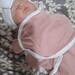 She or he has a closed mouth that has a wet glossy look. You will need to support her/his head as would a real newborn. Her cute little round head flops back & forth just like a real baby. Her/his fine baby hair is drawn in with a faint mist of brown paint. If you choose the heavy option from the drop-down in this listing, the soft cloth body is weighted & stuffed with fluffy fill to round her/him out. Her arms & legs are weighted as well; she/he can even sit up nicely.
