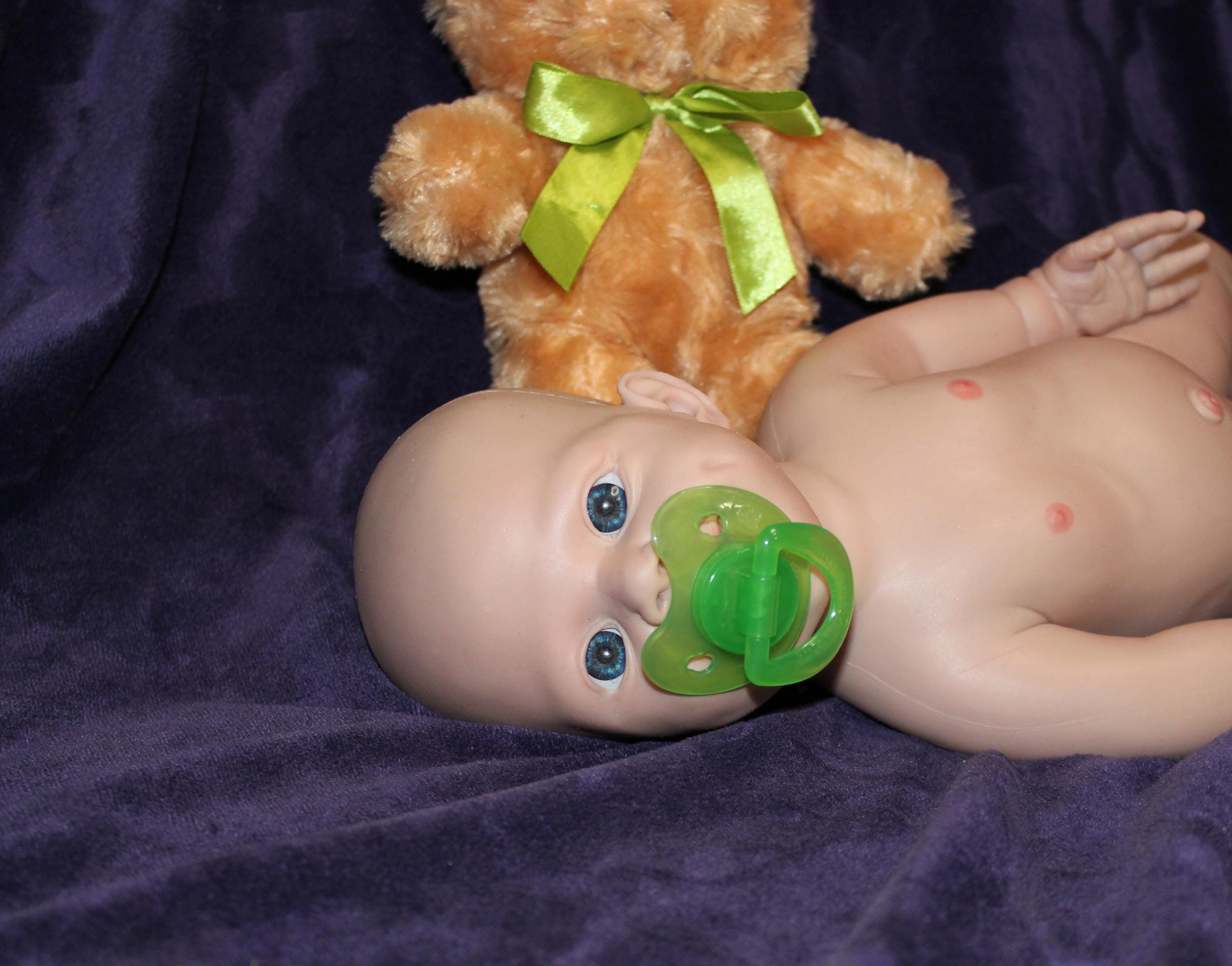She/he has an open mouth. She/he has anatomy-correct body parts. You can even bathe her/him, but I would be very gentle when bathing since this is a hand-painted doll. The ecoflex platinum silicone makes the skin very real and very soft to the touch. Her/his cute little round head flops back and forth just like a real baby would. Her head is bald. The silicone doll has seam marks on the body from the silicone pour. The top of the head will have a small circle birthmarks created from the silicone pour. It is not noticeable and does not take away from the appearance of the silicone baby doll itself.