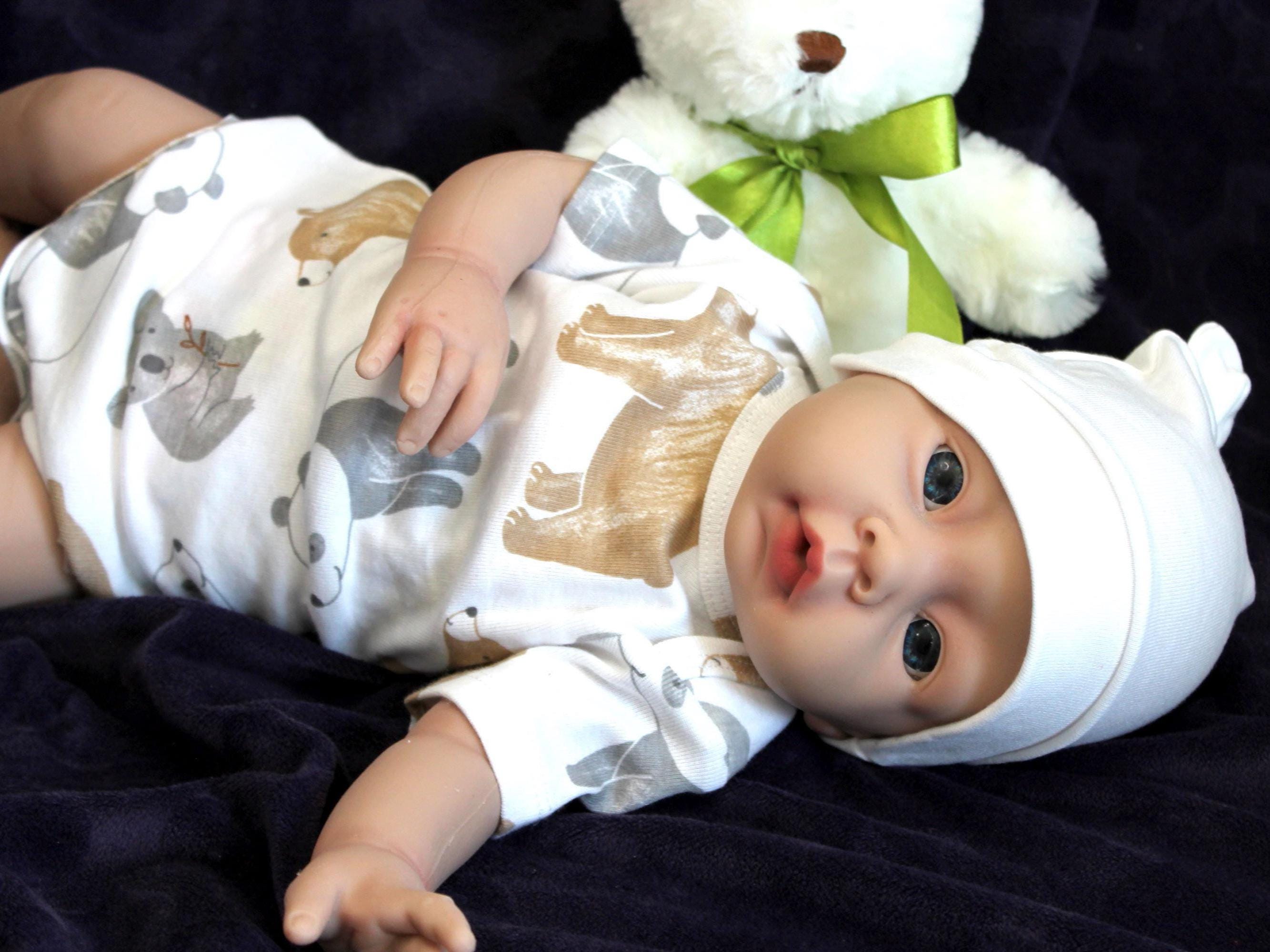 She/he wears real baby clothes in newborn size, and you can even purchase her/his whole wardrobe at your local department store. She/he will come with an extra outfit. The newborn size fits perfectly. Of course, she/he is wearing a real diaper. I have also included little extras in the box: a blanket, a pacifier, and a bottle.